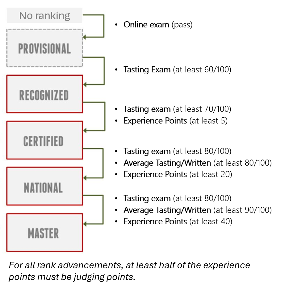 The Apprentice level is assigned to those who do not pass the Tasting Exam (score <60/100). Of course, the exam can be retaken. The Provisional level is assigned once the online exam is passed. The other four levels that can be reached through exams are Recognized, Certified, National, and Master. Advancement between these 4 ranks is based on exam scores and experience points.