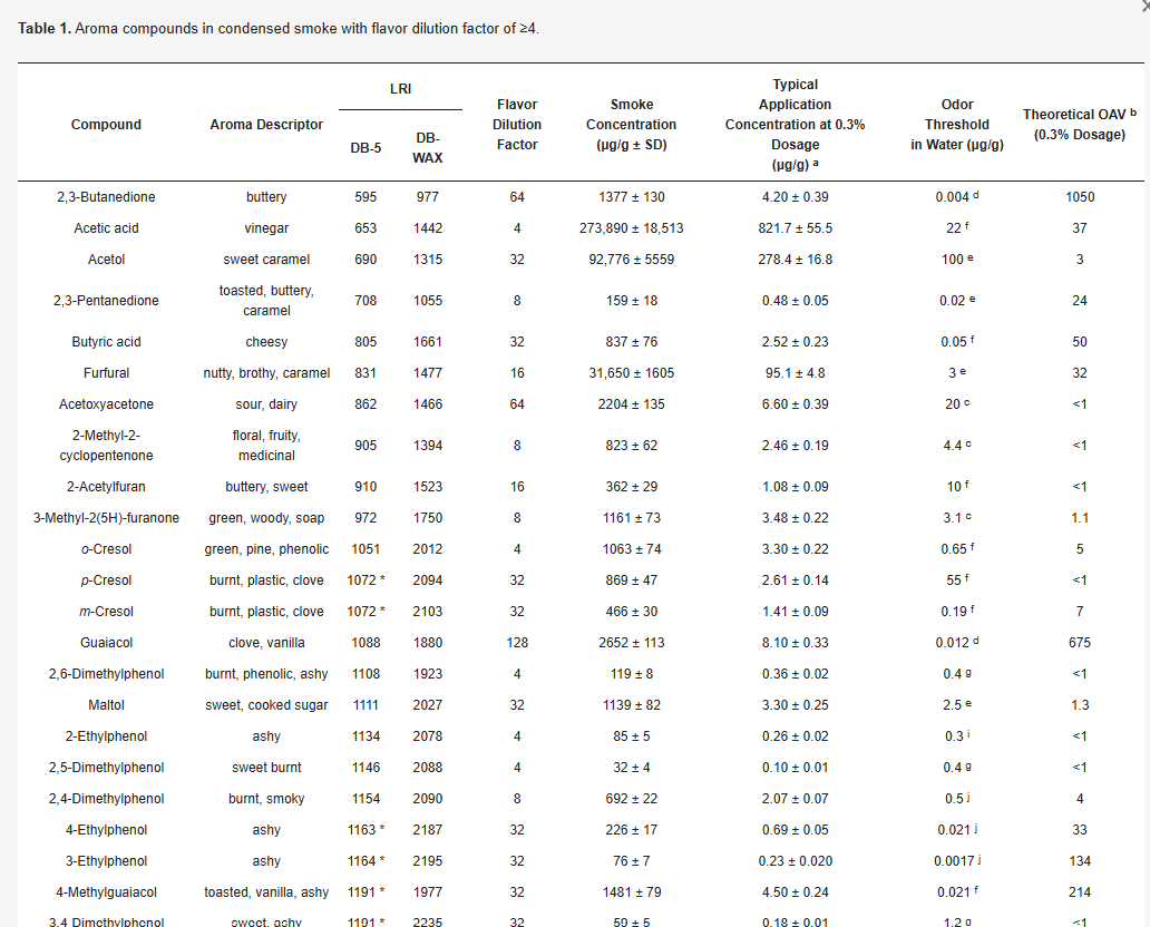 Sono andato a cercare online e ho scoperto che l’affumicatura può tirare fuori dal legno aromi molto variegati, a seconda del composto che brucia (link). Questo è abbastanza ovvio; meno ovvi sono gli aromi che possono generarsi. La tabella sotto riporta un estratto degli aromi descritti nell’articolo. Oltre a quelli più scontati, come bruciato, plastica, medicinale, cenere e chiodo di garofano, troviamo descrittori più specifici come burroso (buttery) e formaggio (cheesy). Questo è molto interessante, perché si collega direttamente alla scamorza che citavo prima.